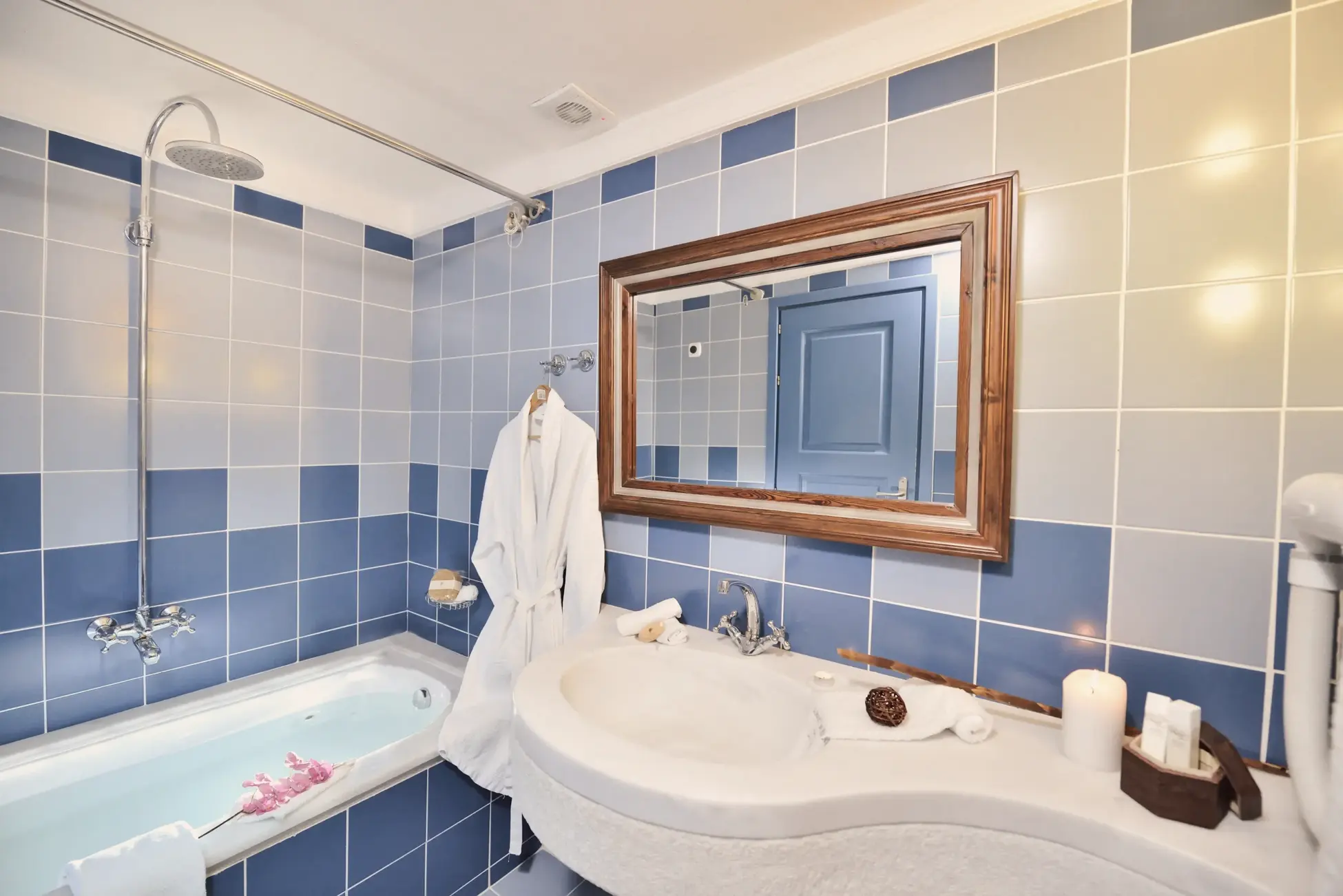 A charming interior staircase connects the two levels, leading to the highlight of the suite: a spacious private veranda overlooking the stunning landscaped pool area. Here, you can unwind in your outdoor jacuzzi, enjoying the ultimate relaxation experience in a luxurious, serene setting.